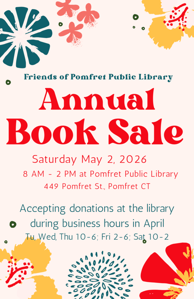 Book Sale!Saturday May 2, 8am – 2pmPomfret Public Library Friends of Pomfret Public Library will be hosting their annual Book Sale on Saturday, May 2 from 8AM to 2PM. 100% of our library programs are funded by the Friends and this is their primary annual fund raising event. DONATIONS NEEDED!Please bring your book donations to Pomfret […]